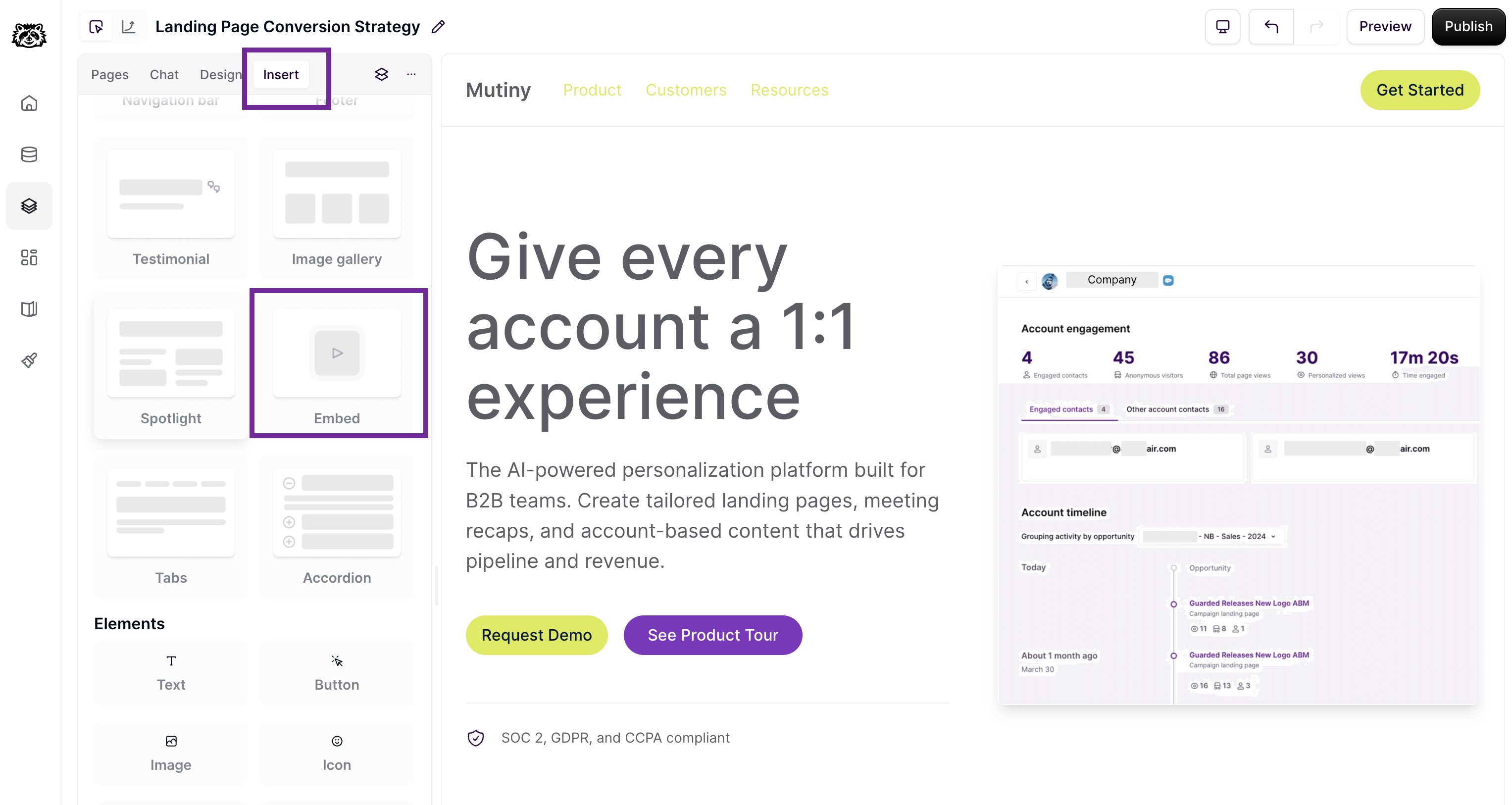 To add a form to a Mutiny Asset, you will want to use the Embed section. You can add this to your asset from the Insert tab in the editor