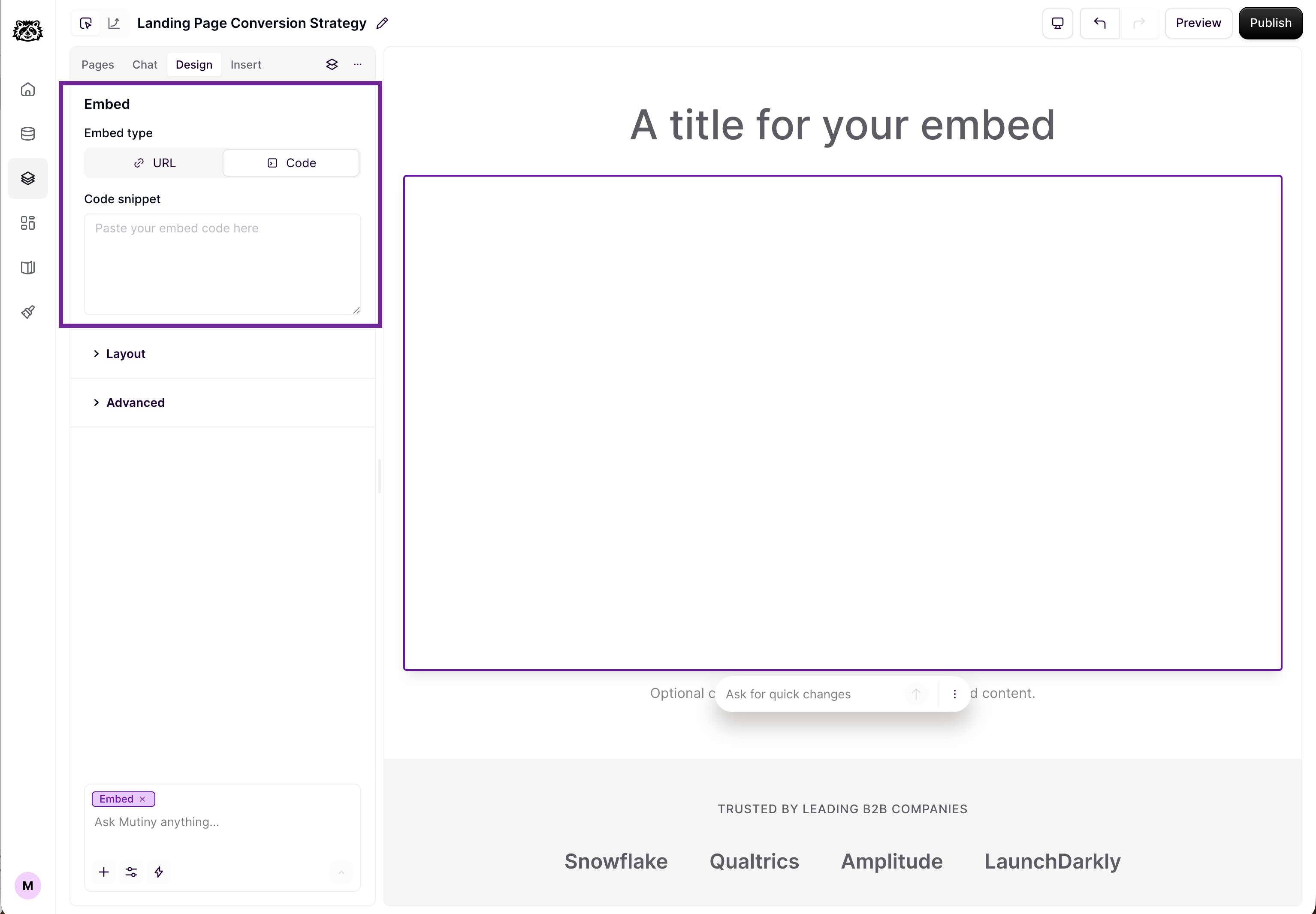 Once the embed code is added, your embedded form will display in the block. You can then adjust the embed block styling via the Design tab or prompt the agent via the Chat tab to make design changes.