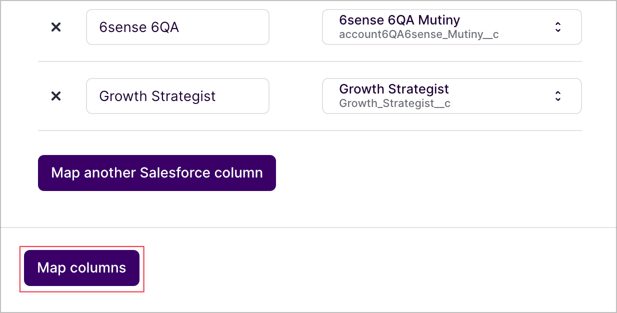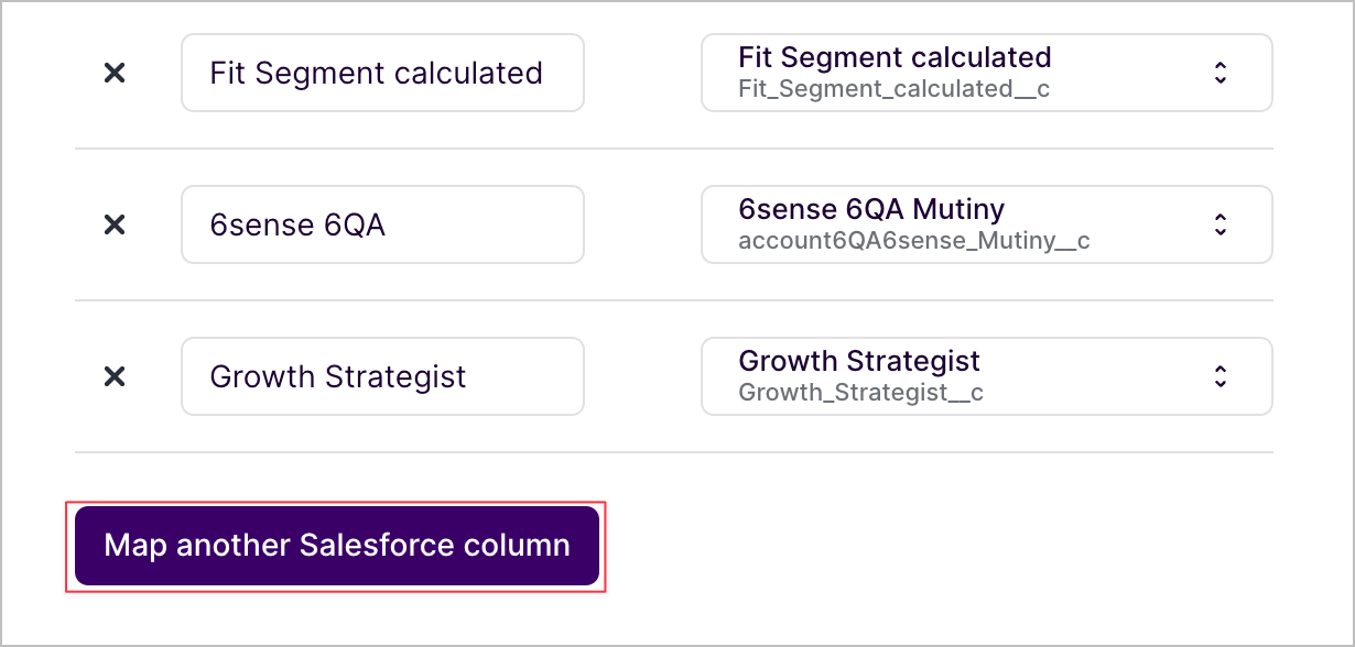You can also add custom fields by selecting "Map another Salesforce column" at the bottom of the modal. You can then type what you'd like to call this field in Mutiny, and select the corresponding Salesforce field.