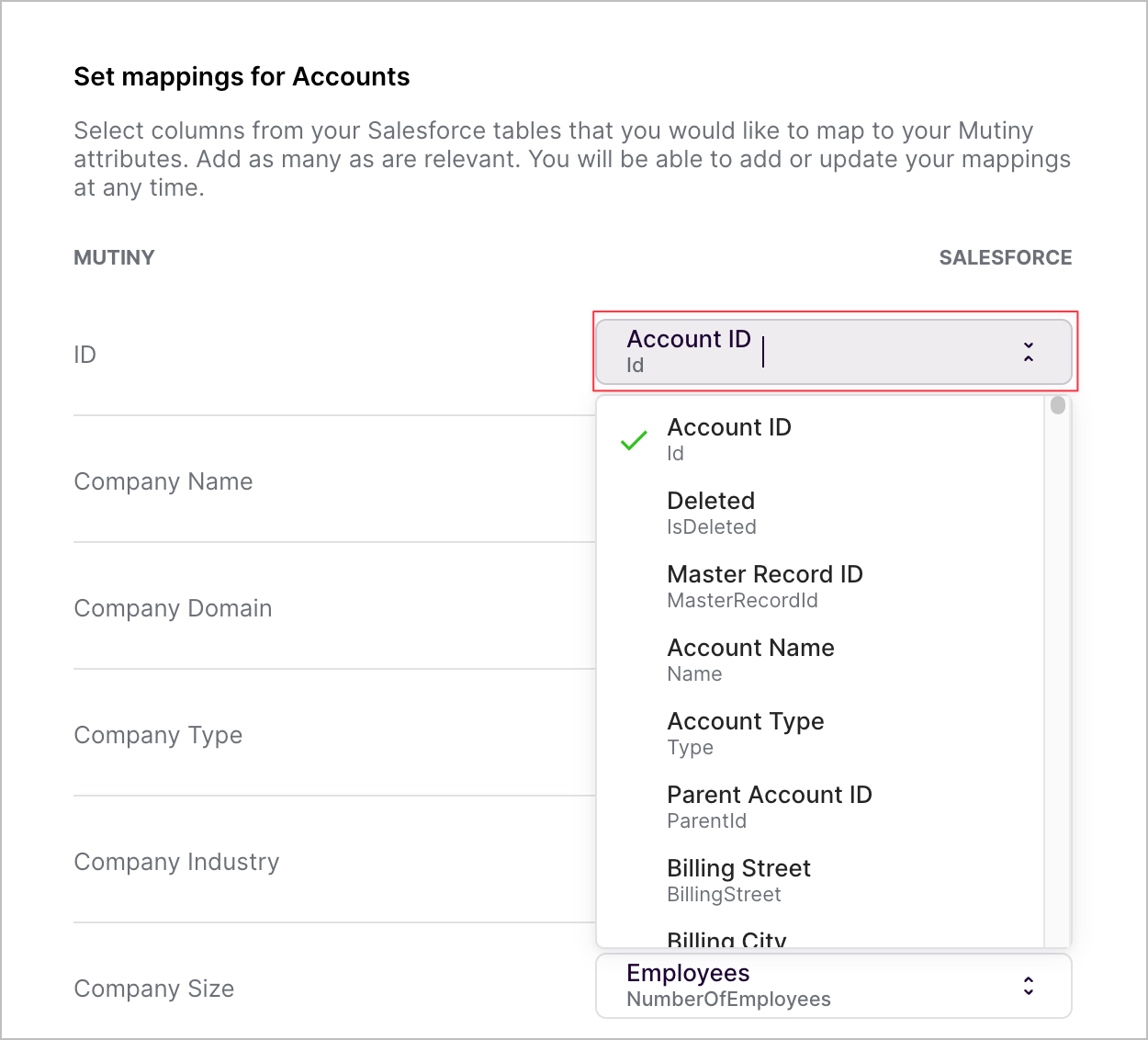 On the left-hand side, you'll see your Mutiny fields. Mutiny will automatically map a number of these for you. On the right-hand side, you'll see the Salesforce field that it corresponds to. To change this field, select the dropdown of the field you'd like to update and select the appropriate Salesforce field.
