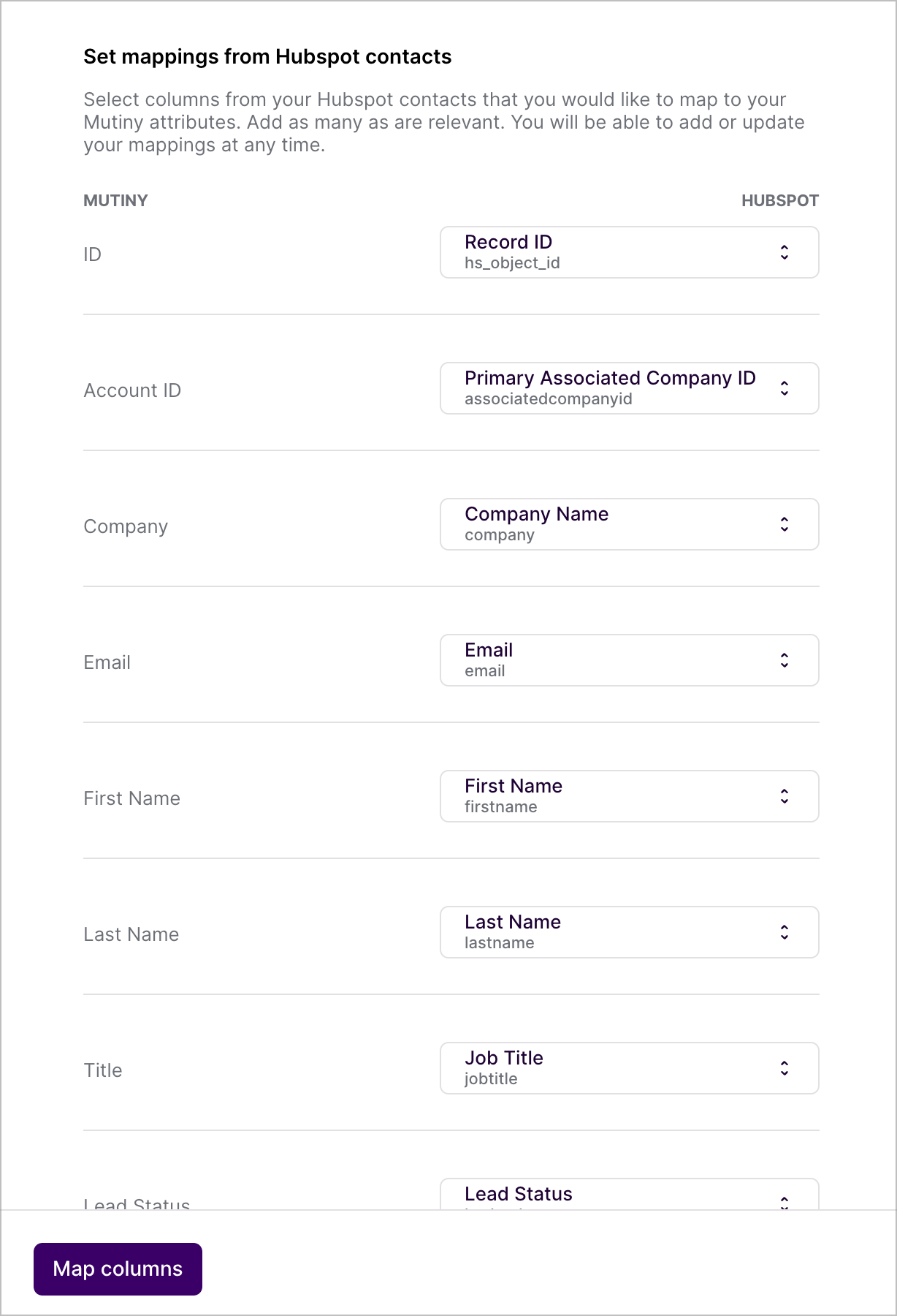 Select whichever attributes you want to have available in Mutiny. You can map columns from both your Contacts and your Accounts objects. You can add additional columns by clicking the Map another Hubspot column button at the bottom. When you are finished with your selection, click Map columns.