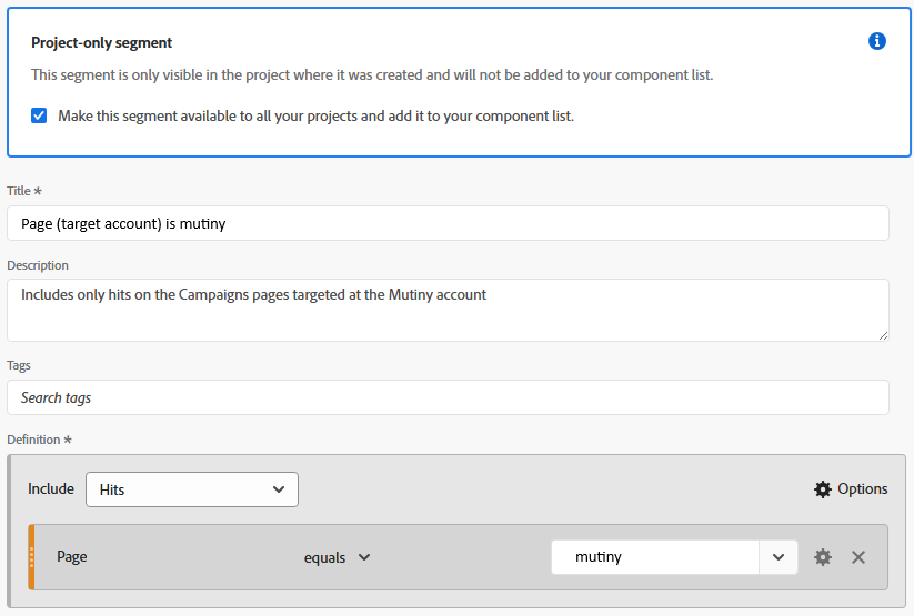 - Add a Segment on your report to include only Hits where the ‘Page Domain’ matches your custom sub-domain. If ‘Page Domain’ or a similar eVar is not available in your implementation, you may also use ‘or’ conditions in a Segment to include hits where the ‘Site Section’ matches any of your assets.