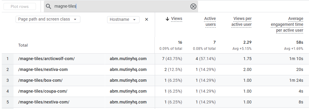 - With Page path and screen class as the Primary Dimension, use the ‘Search’ box to filter for the asset prefix that you used in your page URLs. This will give you asset-wide performance at the top of the report, and a breakdown by target account in the table.