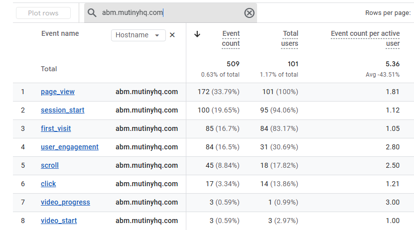 - Event Name as the Primary Dimension, add Hostname as the Secondary Dimension, and use the ‘Search’ box to filter for your custom subdomain. This will give you site-wide performance at the top of the report, and a breakdown of actions in the table.