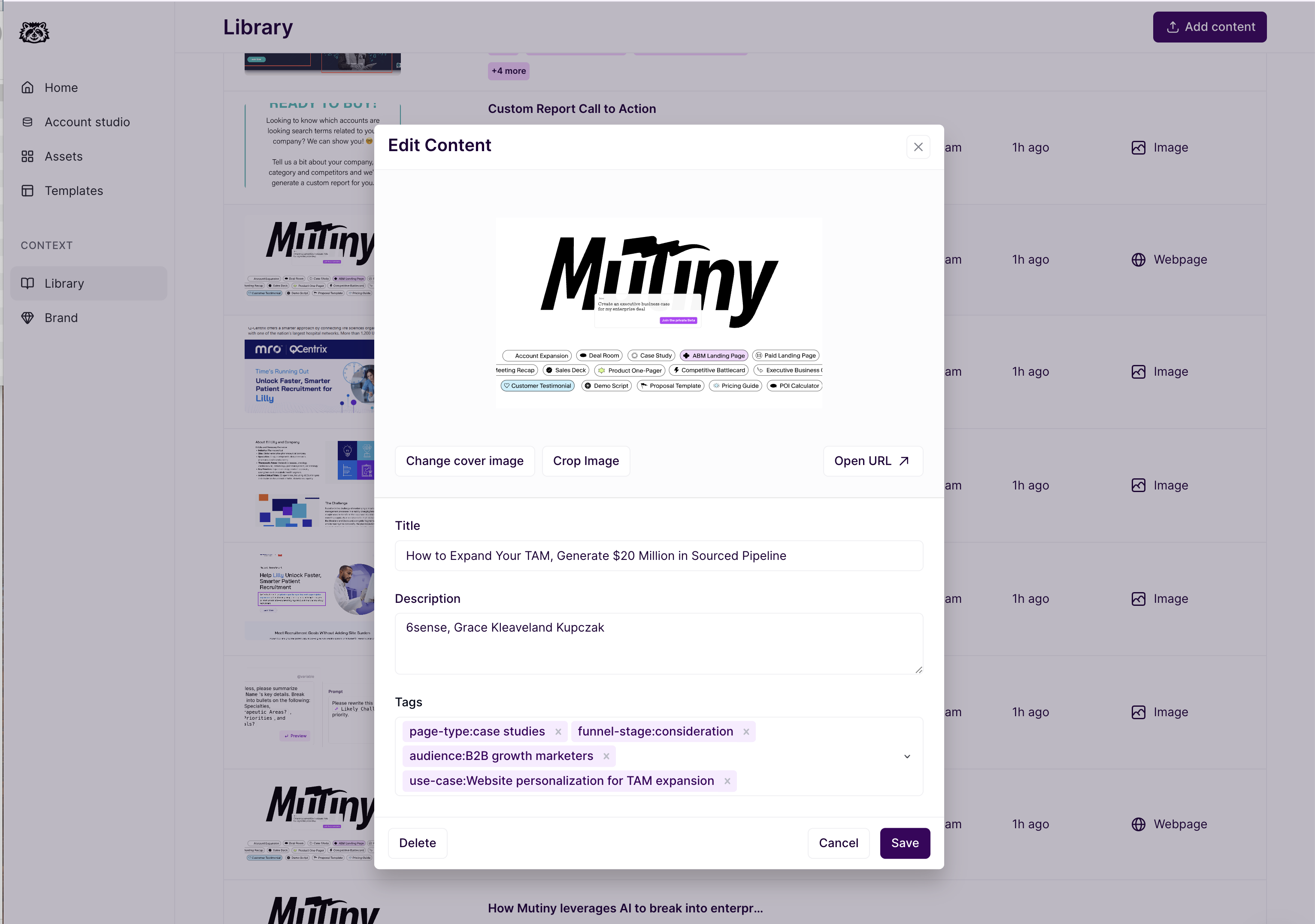 Once uploaded, click into one of the images, and you will be able to crop the image, add a description, and give it a title. If you uploaded the wrong file, this is also where you can delete the image from the Library.