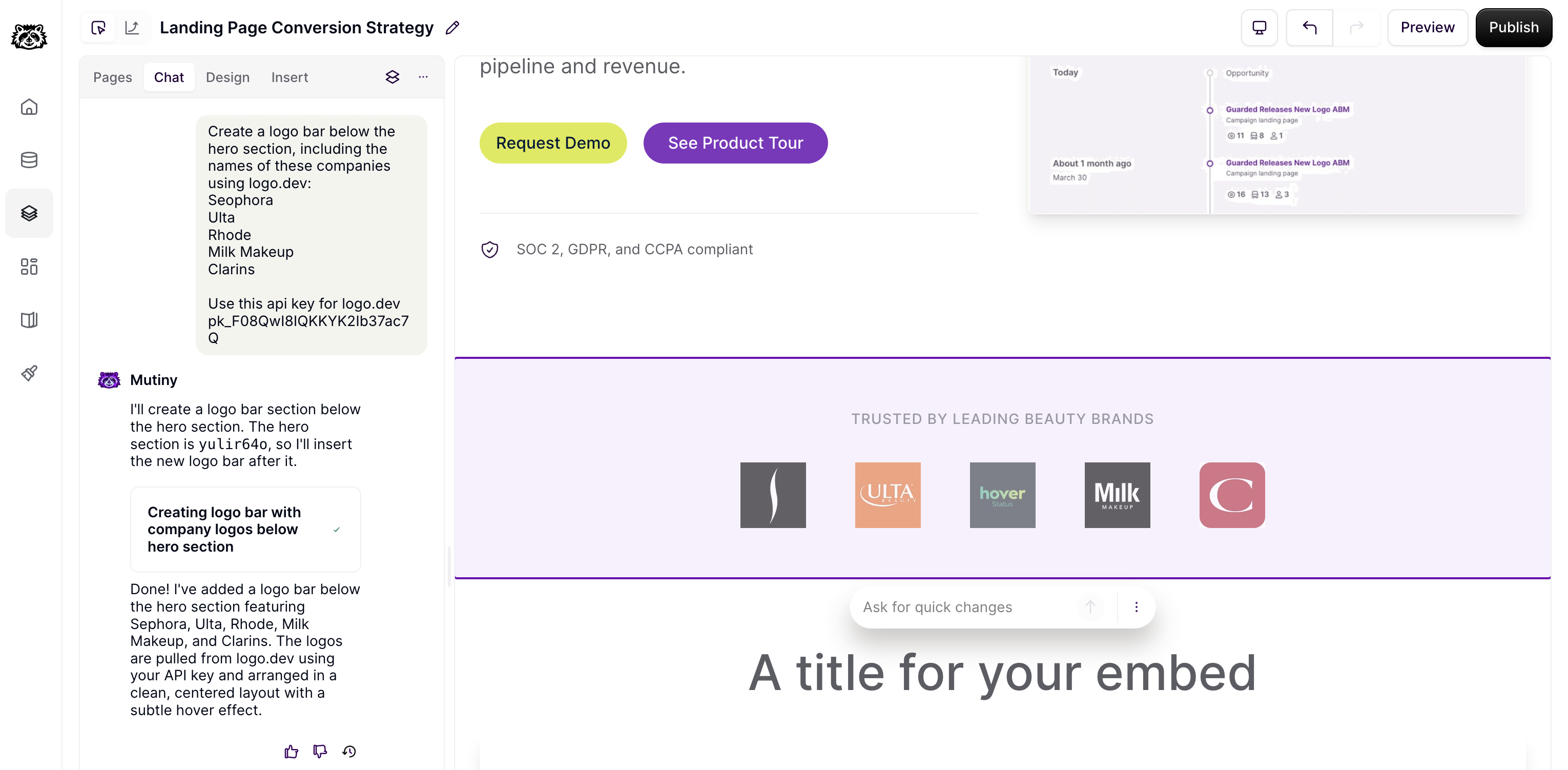 In the Mutiny Asset editor, open up the Chat tab and ask the Creative Agent to create a new logo bar section. In this query, tell the creative agent to use Logo.dev, note any companies you want to be added to the logo bar, then paste in the API key copied earlier.